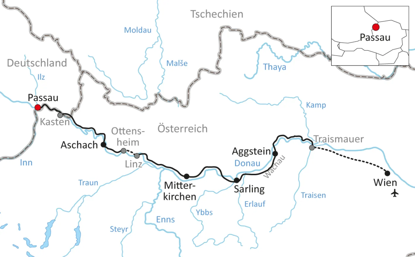 Radurlaub auf dem Bauernhof entlang der Donau – Entdecken Sie die Donau auf zwei Rädern! Starten Sie in Passau, der Drei-Flüsse-Stadt mit historischem Flair, und radeln Sie über die österreichische Grenze durch malerische Flusslandschaften. Auf der Route erwarten Sie charmante Orte wie Engelhartszell, Aschach und Linz, idyllische Regionen wie das Machland sowie die beeindruckenden Landschaften des Strudengaus. Die berühmte Wachau begeistert mit Burgen, Schlössern und Weindörfern, darunter das Stift Melk und die Burgruine Aggstein. Den krönenden Abschluss bildet Wien mit seinen kulturellen Highlights und kulinarischen Genüssen. Unterwegs übernachten Sie auf gemütlichen Bauernhöfen oder kleinen Landgasthöfen und erleben das echte Landleben hautnah. Dieser Radurlaub verbindet Natur, Kultur und Genuss – perfekt für Aktivurlauber und Familien.
